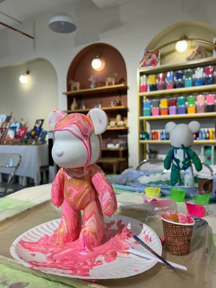 Grâce à la technique du paint pouring, vous versez les peintures sur un ourson blanc (23 ou 33 cm).